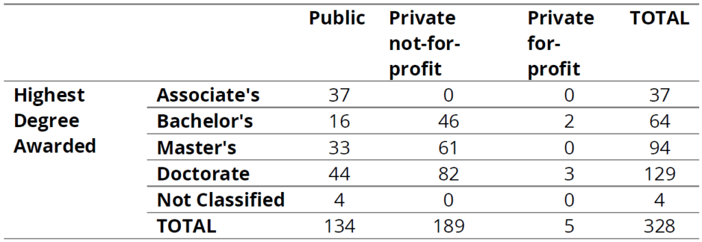 This year’s survey was completed by 328 institutions. Participants entered data manually and were given the instruction to report benefits information for regular full-time employees as of January 1, 2026 (projected if necessary).[2] Where a question does not collect information on whether benefits offerings differ by employee type (e.g., staff vs. faculty), participants entered data for the program or policy that applied to the greatest number of regular full-time employees.