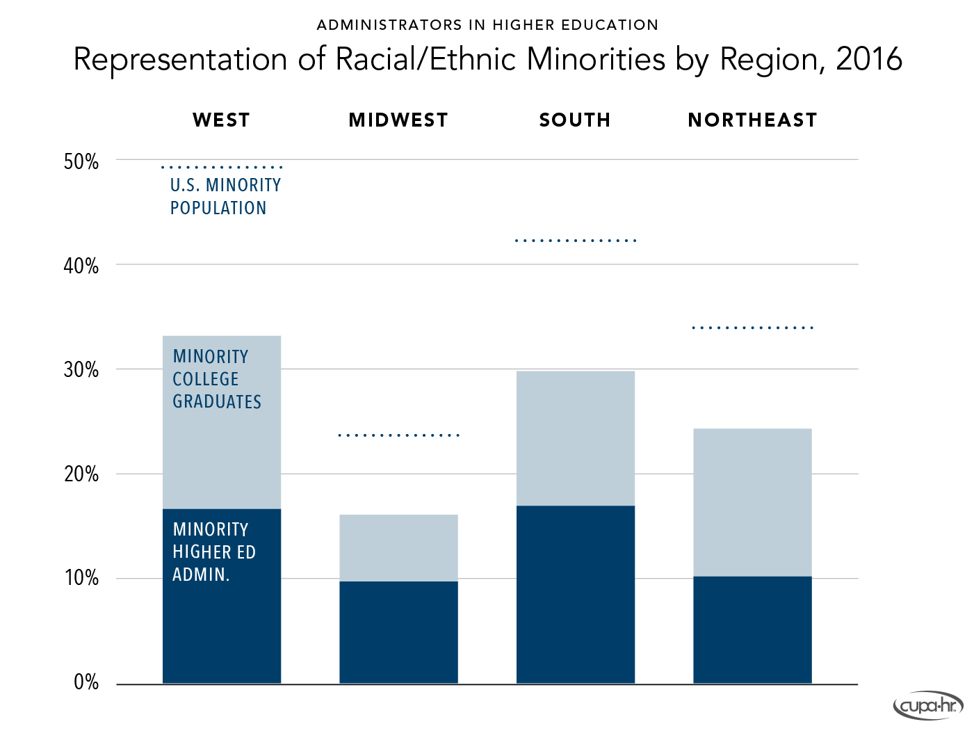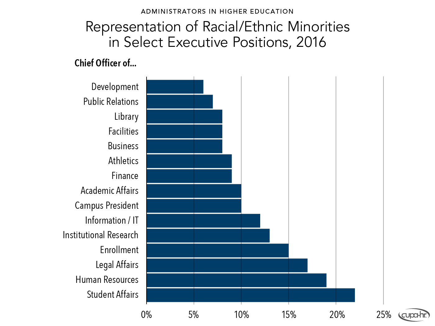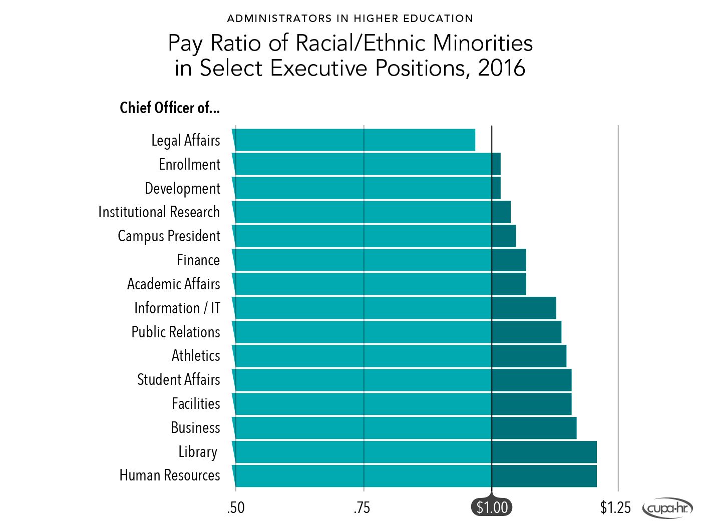 Bichsel, Jacqueline, & McChesney, Jasper (2017, March). Pay and Representation of Racial /Ethnic Minorities in Higher Education Administrative Positions: The Century So Far (Research Report). CUPA-HR. https://www.cupahr.org/resource/2017-pay-and-representation-of-ethnic-minorities-in-higher-education-administrative-positions/