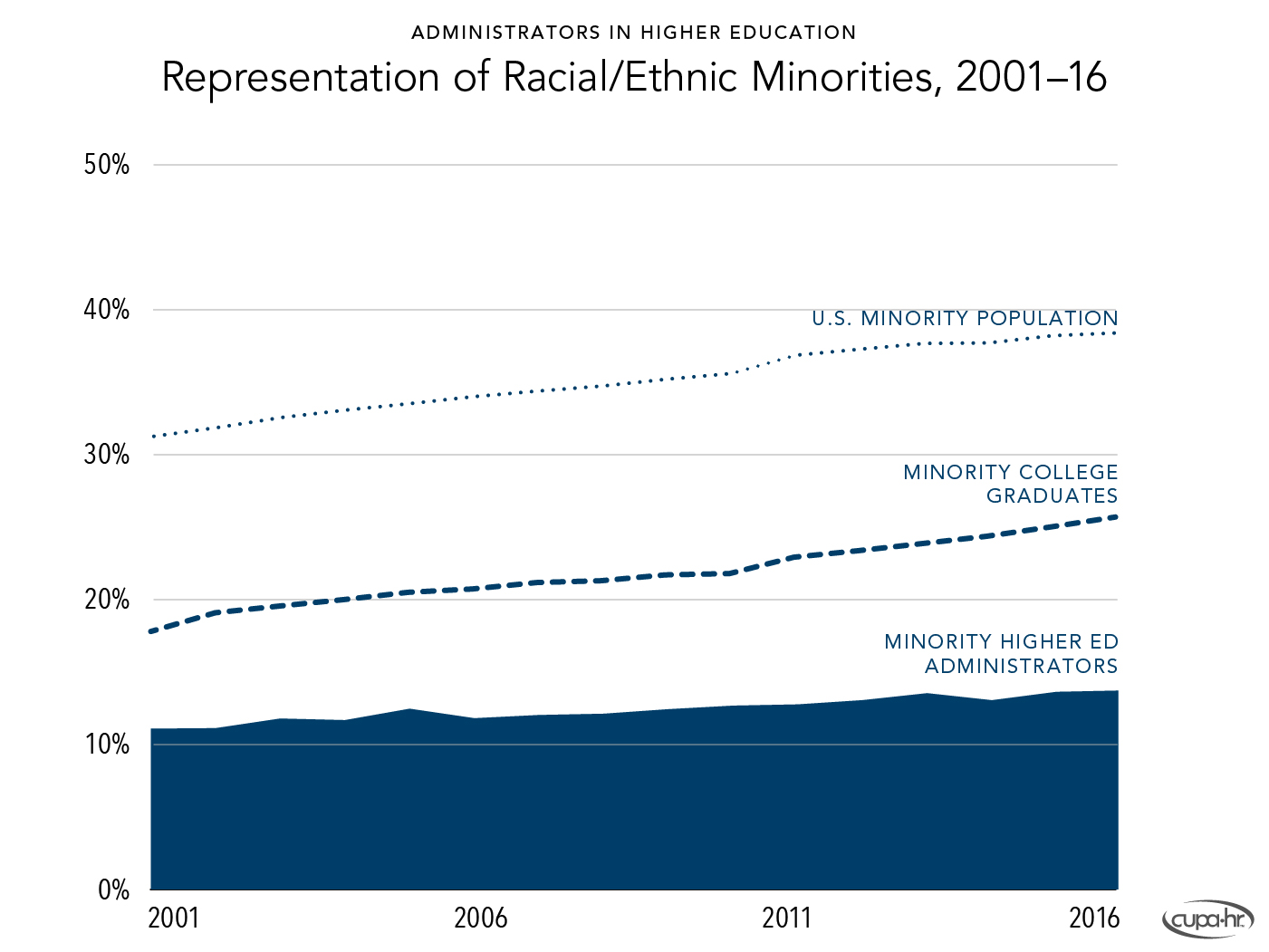 Figure 2 shows the increases over time in the U.S. minority population (as a percentage of the overall population),[15] the percentage of college graduates who are racial /ethnic minorities,[16] and the percentage of higher ed administrative positions occupied by racial /ethnic minorities since 2001.[17] Although there has been a slight increase in the representation of minorities in the past 15 years, the increase has not kept pace with the increase in the U.S. minority population or the increase in minority college graduates over this same period. Therefore, the gap between the representation of minorities in these positions and the population of minorities with graduate degrees is increasing rather than decreasing.