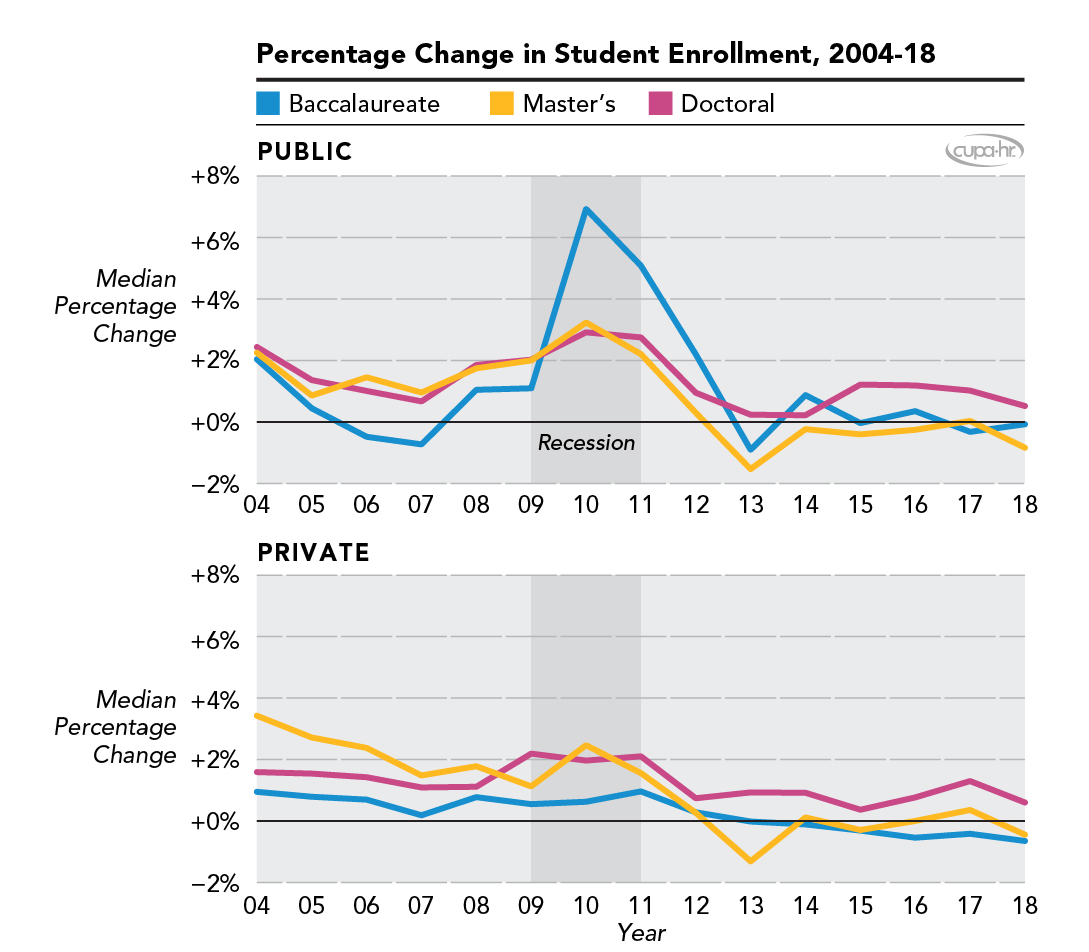 Li, Jingyun; McChesney, Jasper; & Bichsel, Jacqueline (2019, February). Impact of the Economic Recession on Student Enrollment and Faculty Composition in U.S. Higher Education: 2003-2018 (Research Report). CUPA-HR. https://www.cupahr.org/resource/2018-impact-of-the-economic-recession/