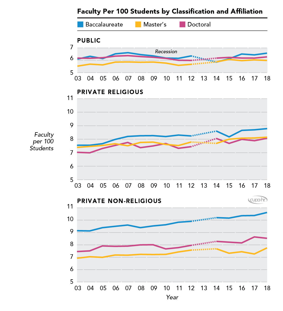 Figure 4 shows the number of full-time equivalent (FTE) faculty per 100 FTE students by institution classification and affiliation.[12] Faculty-student ratios have historically been substantially higher in private institutions than in public ones, and we see this definitively in our data (Figure 4). Private non-religious baccalaureate institutions in particular had the highest faculty-student ratio among all types of institutions for the entire period displayed, 2003 to 2018. Also depicted in the graph are the differences in post-recession response in regard to faculty-student ratio. For public institutions, the response was to decrease the number of faculty they retained or hired in proportion to their student size, and recovery of pre-recession faculty-student ratios has been slow. Most private institutions were able to maintain or even slightly increase their faculty-student ratio during the recession. For those private institutions that did show a slight decrease during the recession, recovery of their faculty-student ratios was rapid, and they have been increasing steadily ever since.