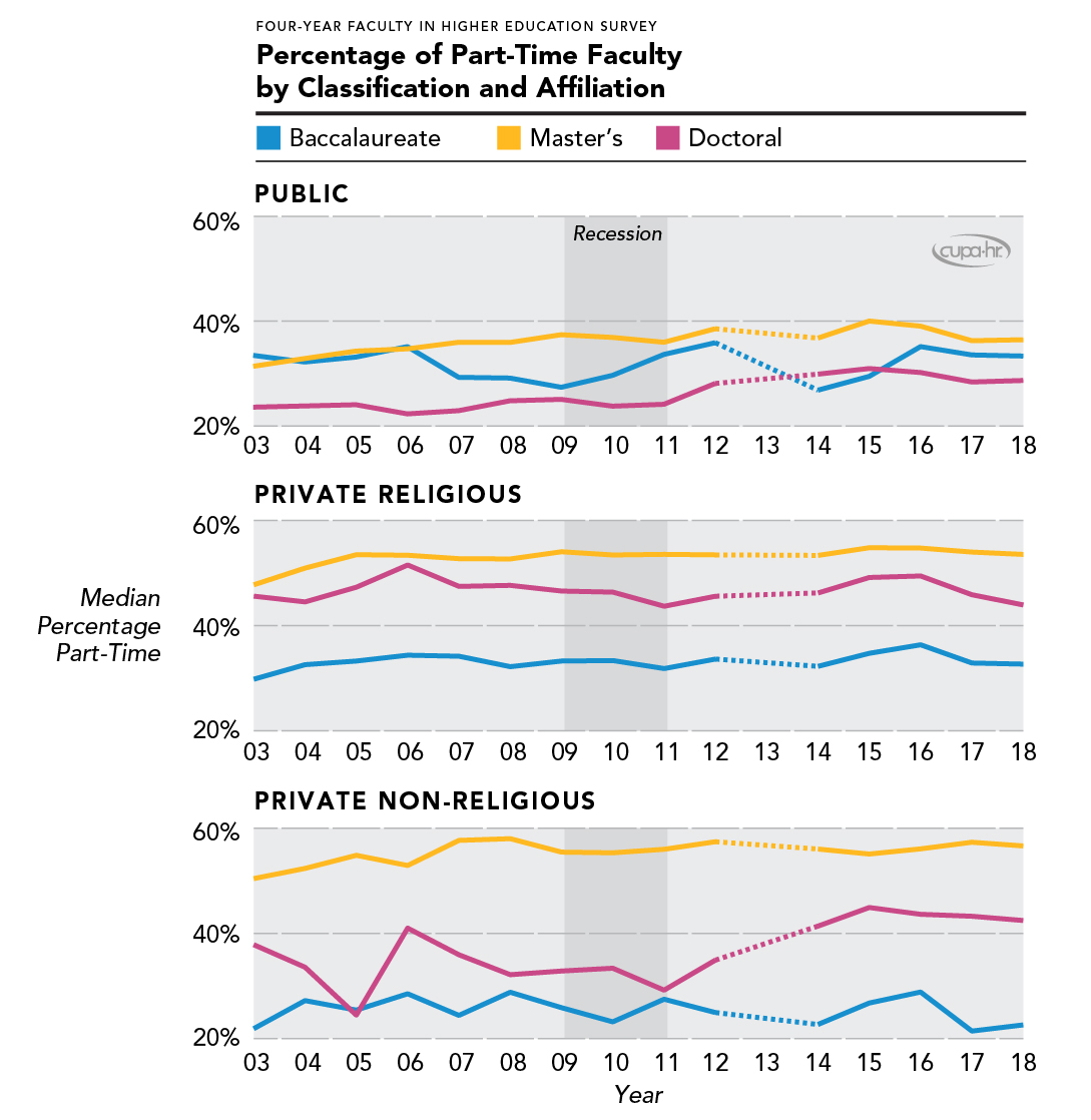 Figure 5 shows the median percentage of PT faculty within the total faculty between 2003 and 2018 by institution classification and affiliation.[21]