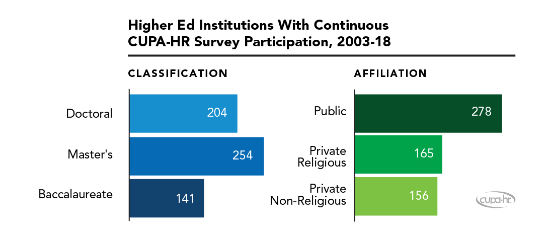 Associate’s institutions were not included, as their participation history was not consistent. Data were collected as part of CUPA-HR’s surveys of administrators, professionals, staff, and faculty in higher education from 2003-18. In this report, “year” refers to the year the academic year ends. For example, 2003 designates academic year 2002-03, and 2018 designates academic year 2017-18.