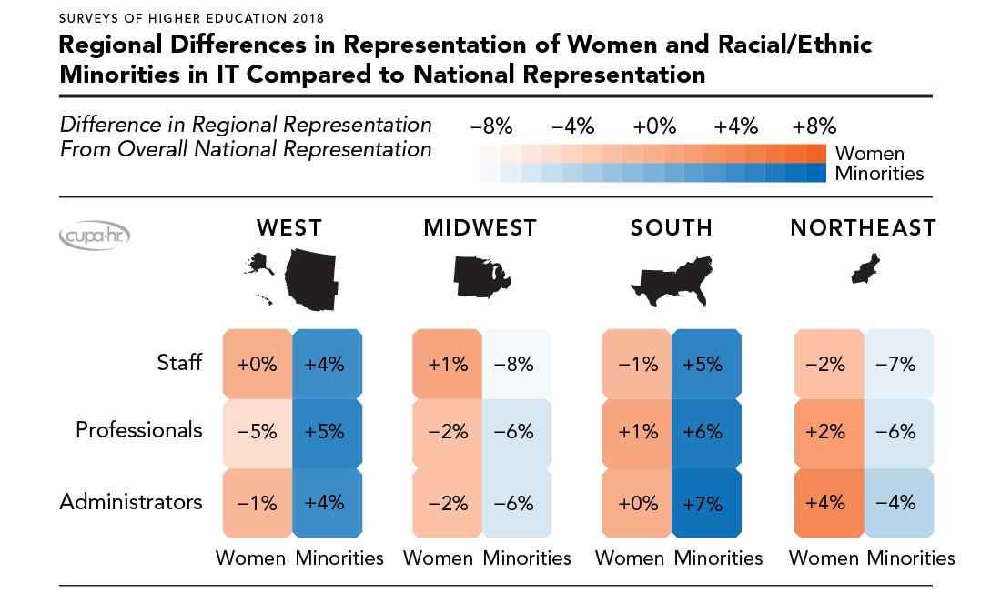 One pathway to increasing the diversity of higher education may be for institutions to recruit experienced individuals from regions of the country with better representation of women and racial/ethnic minorities. Figure 3 shows how much representation in higher education IT within each U.S. Census region varies from the national average.[5]