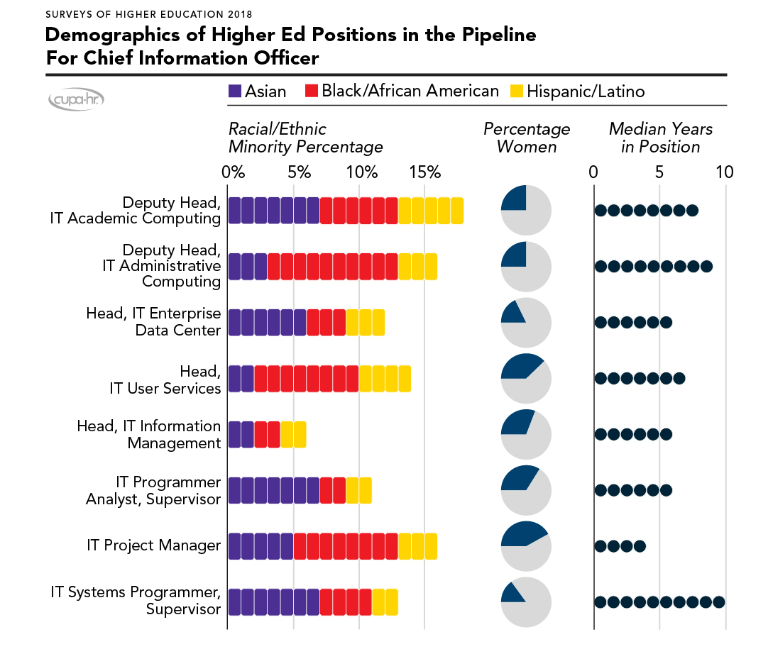 Now, with the help of data from CUPA-HR, it is possible to examine in detail the demographic makeup of the higher education IT workforce, helping to better understand the workforce today and to identify opportunities in the pipeline for future higher education IT leaders.