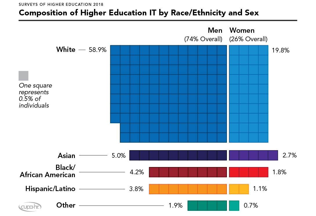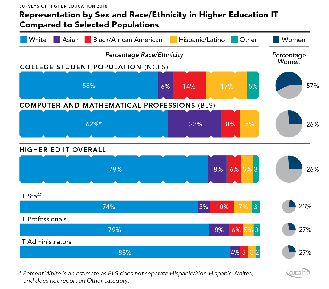 Representation of women and racial/ethnic minorities in higher education IT is much lower than among college students, the primary constituent population they serve.[3] When compared to math and computer occupations more broadly, higher education IT has comparable representation of women, but lower racial/ethnic representation.[4]