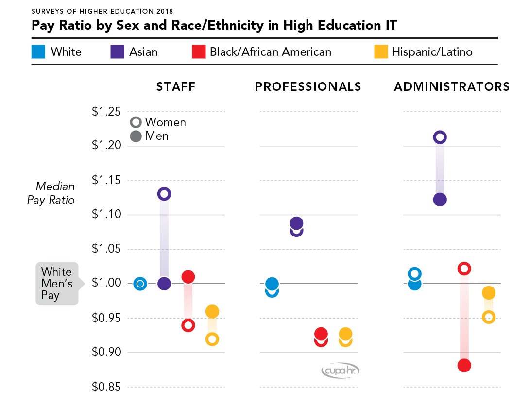 - Despite much lower representation, pay among women and minorities is frequently close or comparable to salaries paid to White men, although large differences occur in certain types of roles (e.g., Black male administrators earn $0.88 per $1; Asians earn as much as $1.21 per $1).