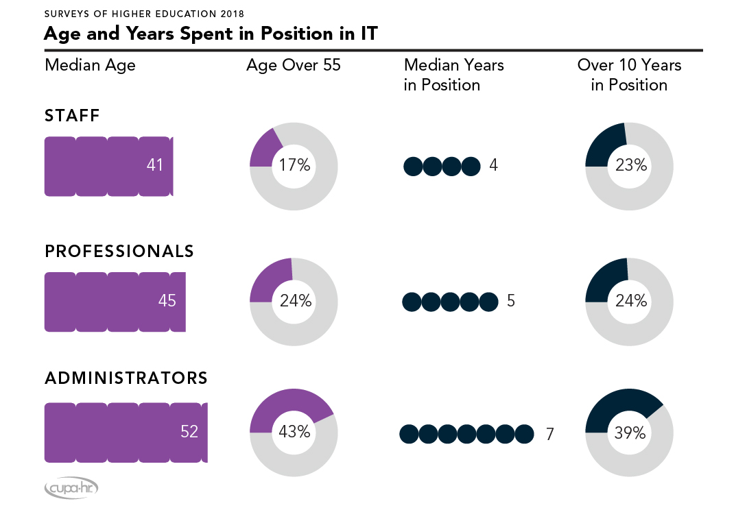 - Around 43% of IT administrators in higher education are over 55 years old, and 39% of IT administrators have been in their current role for more than 10 years. The time to begin succession planning is now — and the data show that certain positions in the immediate higher education IT pipeline may present opportunities to improve DEI in the process.