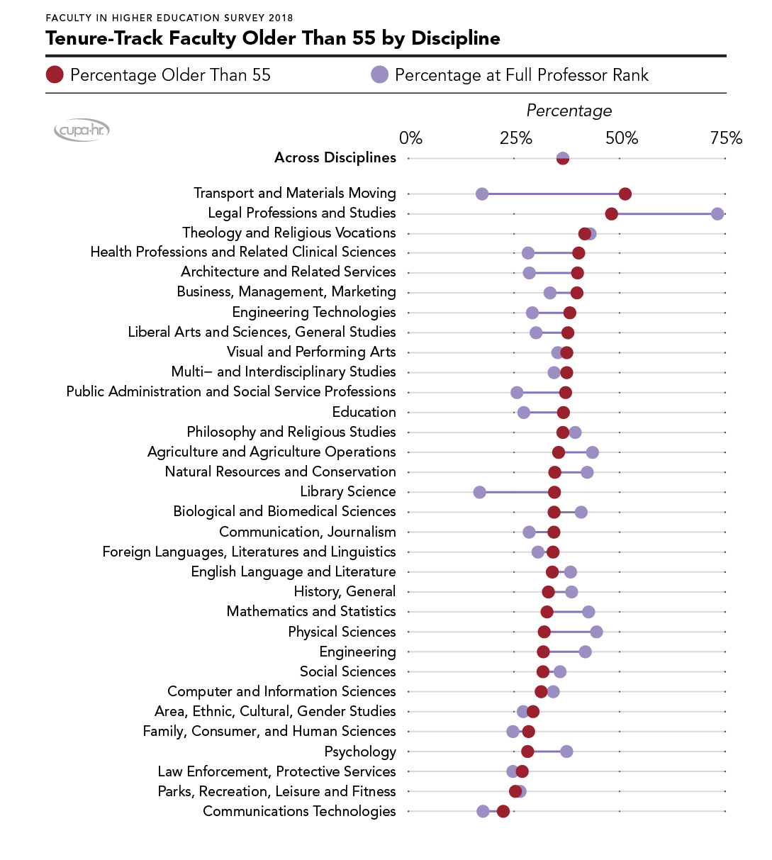 McChesney, Jasper, & Bichsel, Jacqueline (2020, January). The Aging of Tenure-Track Faculty in Higher Education: Implications for Succession and Diversity (Research Report). CUPA-HR. https://www.cupahr.org/resource/2020-aging-of-tenure-track-faculty-in-higher-ed-implications-for-succession-diversity/