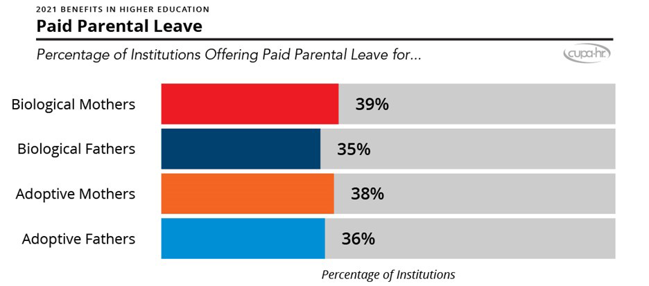 According to the CUPA-HR 2021 Benefits in Higher Education Annual Report, fewer than 40 percent of higher ed institutions offer paid parental leave to new parents. The recently released report examines the benefits offered to higher ed employees, including healthcare plans, wellness programs, paid time off, tuition benefits and retirement.