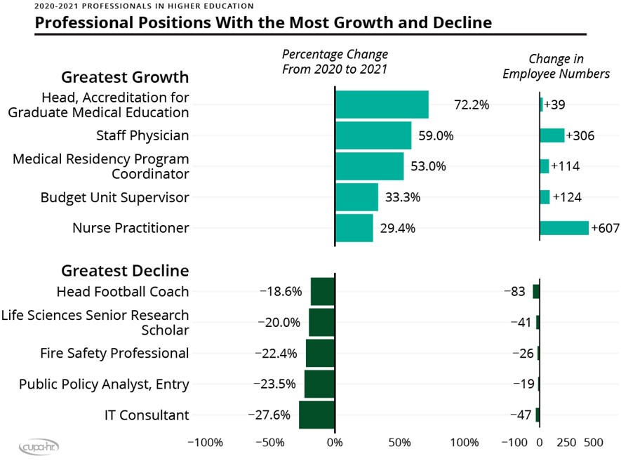 In the year spanning the COVID-19 pandemic, it is noteworthy that four of the five positions with the most growth are in health sciences. The lone exception was the budget unit supervisor position, also noteworthy given the severe budget challenges faced by many higher ed institutions in the past year.