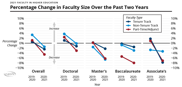 In the academic year prior to the pandemic (2019-20), there was an overall increase in all types of faculty — tenure-track, non-tenure-track and adjunct — with non-tenure-track faculty increasing the most (3.36 percent). This changed drastically in the 2020-21 academic year, when all faculty types experienced overall job losses.